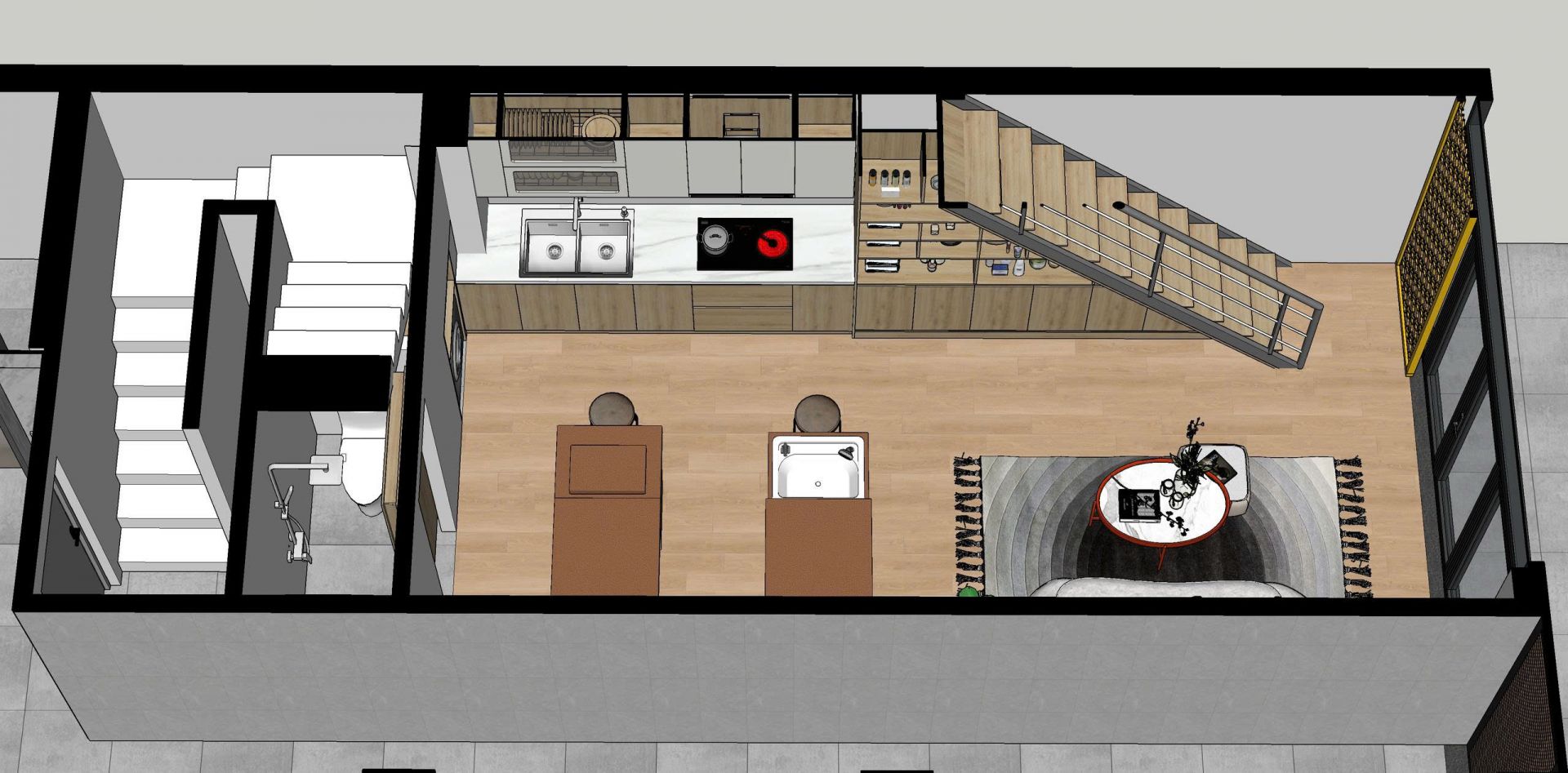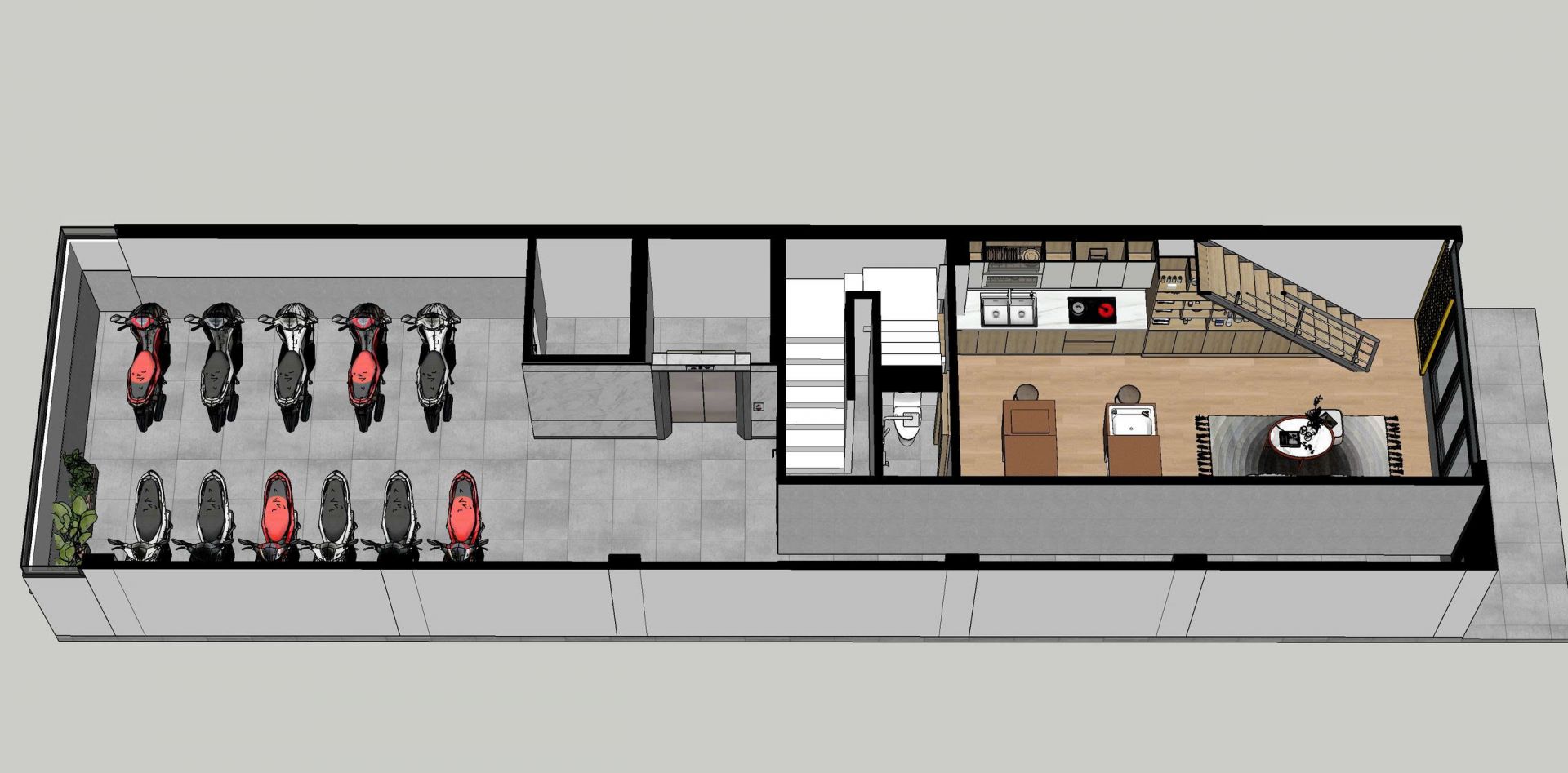 - Tầng 1: phía trước làm phòng cho thuê kinh doanh và phía sau là nhà xe