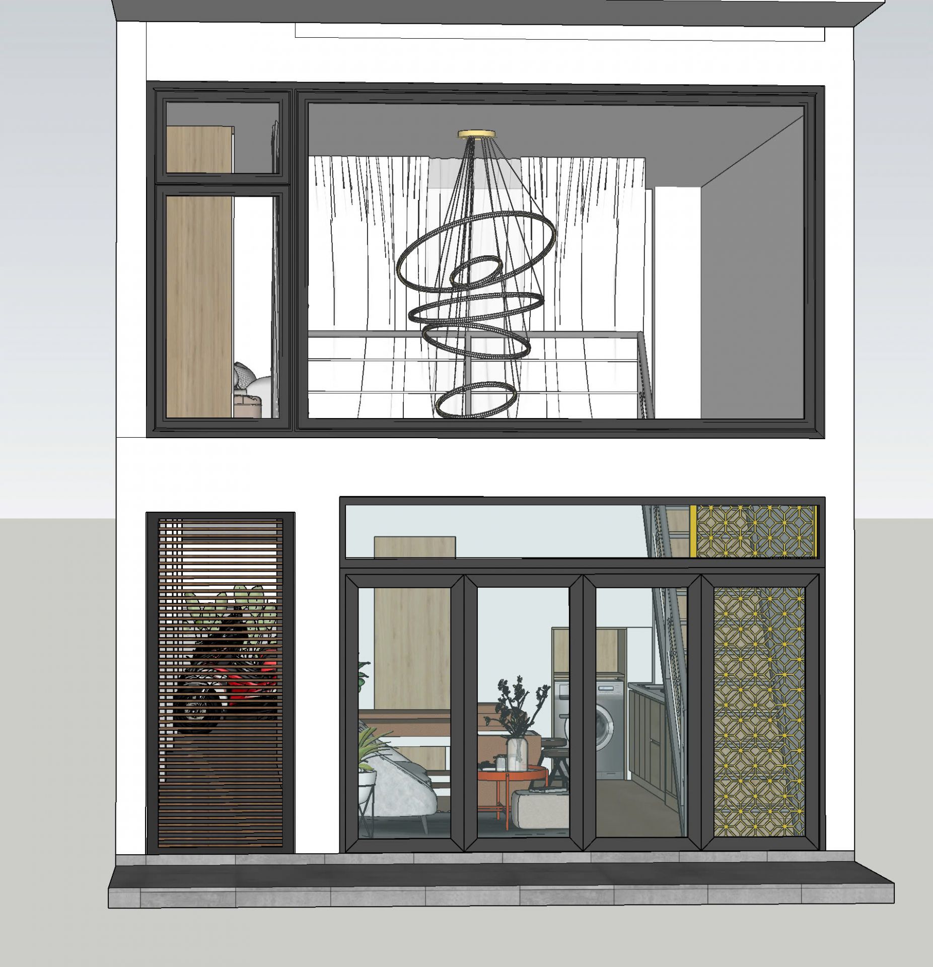 Hệ mặt đứng sử dụng bảng màu tiết chế: trắng – xám – nâu, kết hợp giữa sơn, lam nhôm và vật liệu conwood. Tổng thể mang lại cảm giác hiện đại, bền vững theo thời gian, tránh xu hướng thiết kế “theo mốt” dễ lỗi thời.