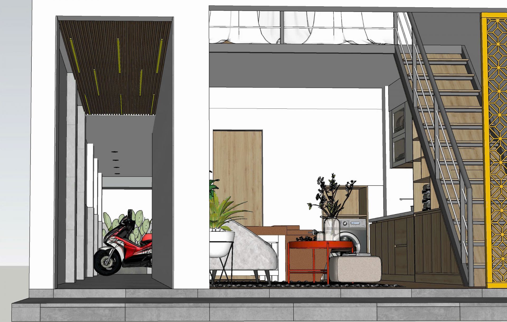 - Tầng 1: phía trước làm phòng cho thuê kinh doanh và phía sau là nhà xe