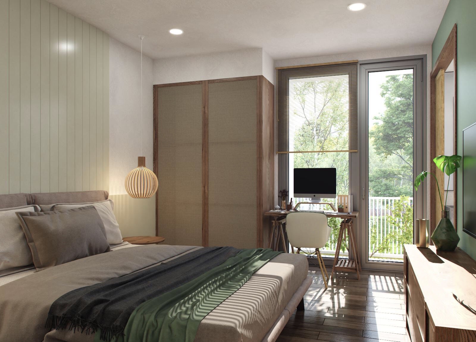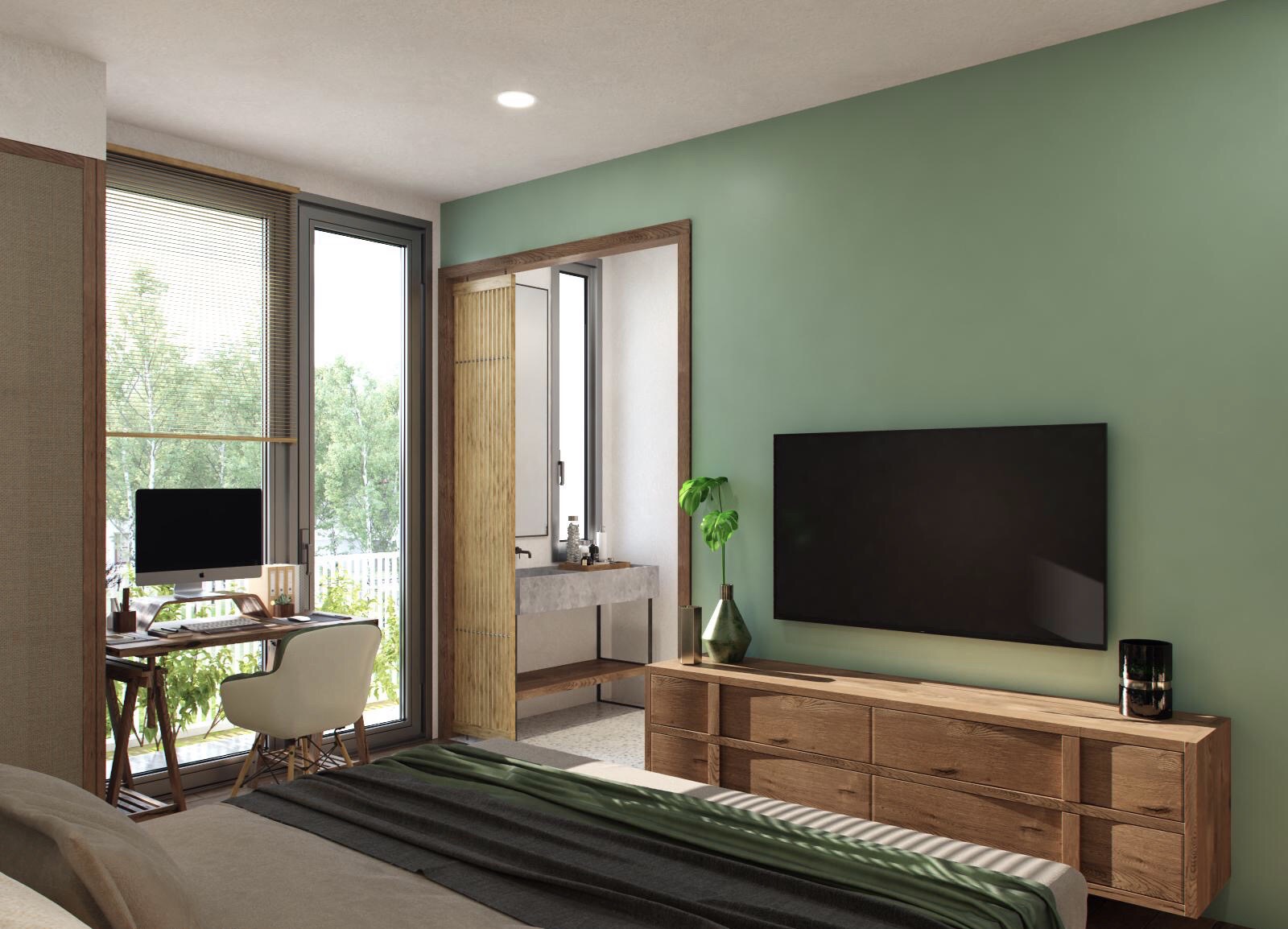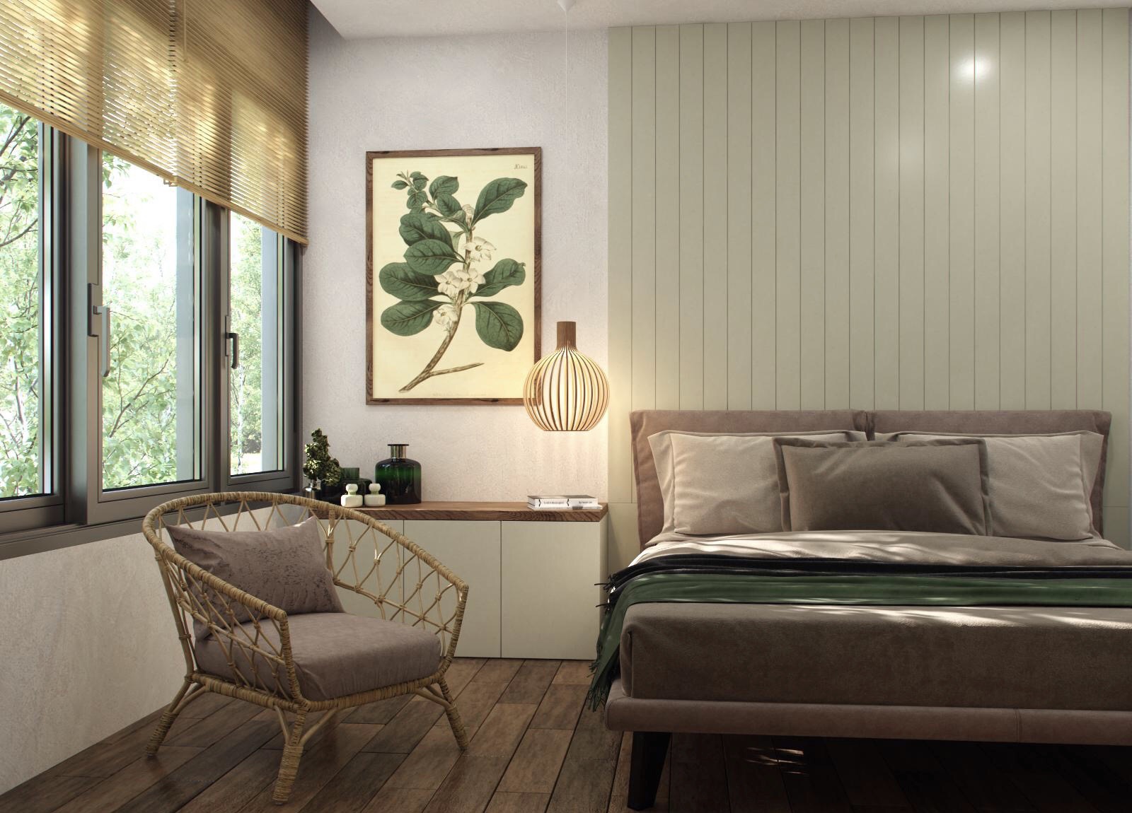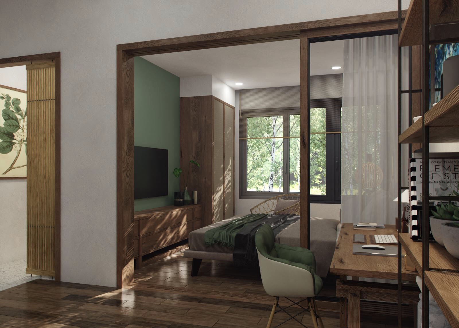 Phòng ngủ master được thiết kế ấm áp. vật liệu gỗ là chủ đạo