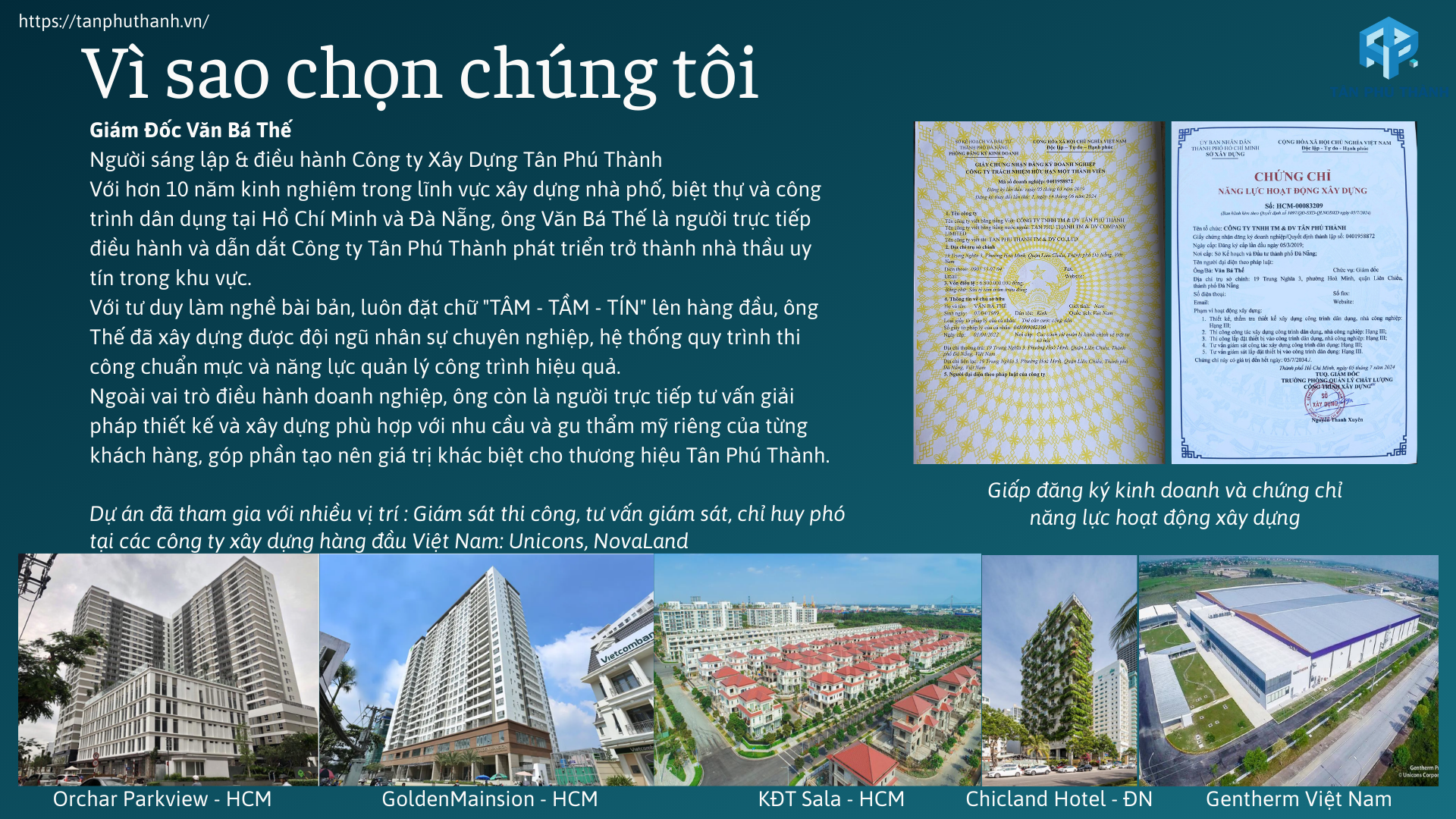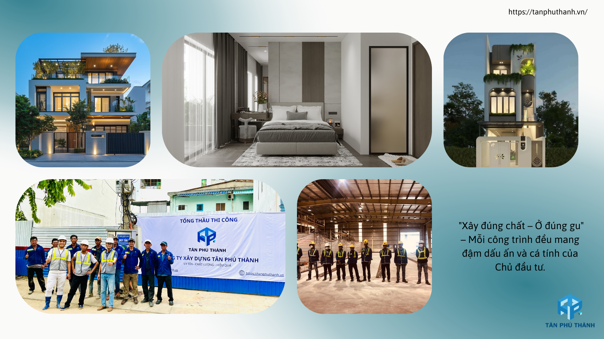 Với phương châm "Xây Đúng Chất – Ở Đúng Gu", Tân Phú Thành cam kết mang đến không gian sống phù hợp phong cách, tối ưu chi phí và đảm bảo chất lượng vượt trội cho mỗi khách hàng.