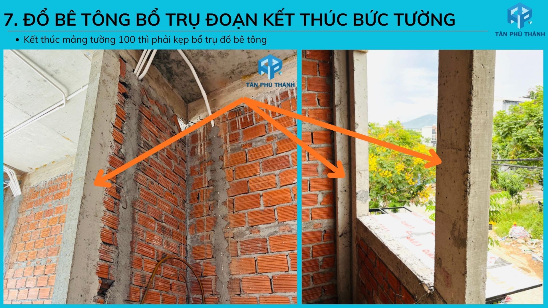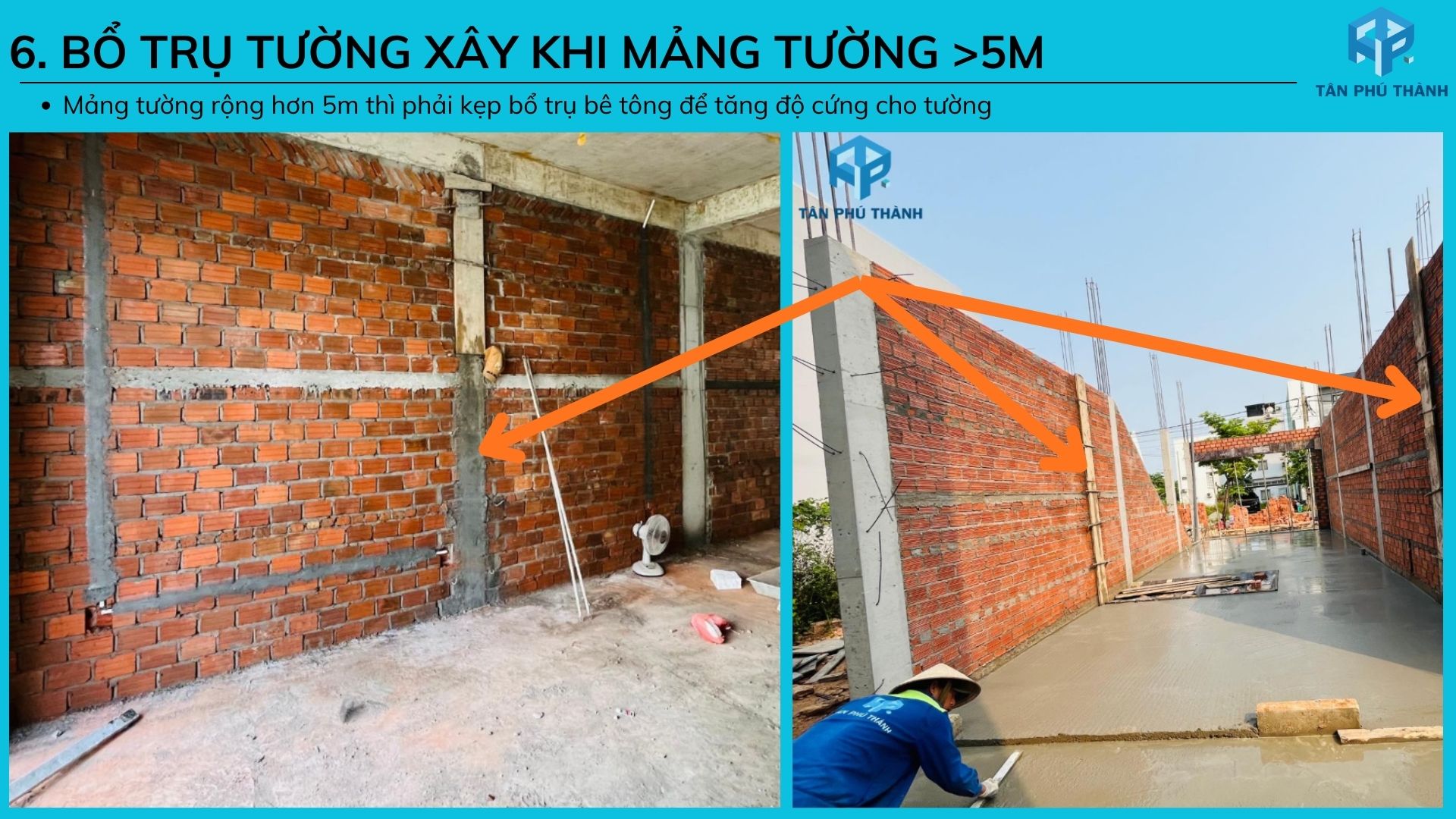 6. Mảng tường rộng hơn 5m thì phải kẹp bổ trụ bê tông để tăng độ cứng cho tường