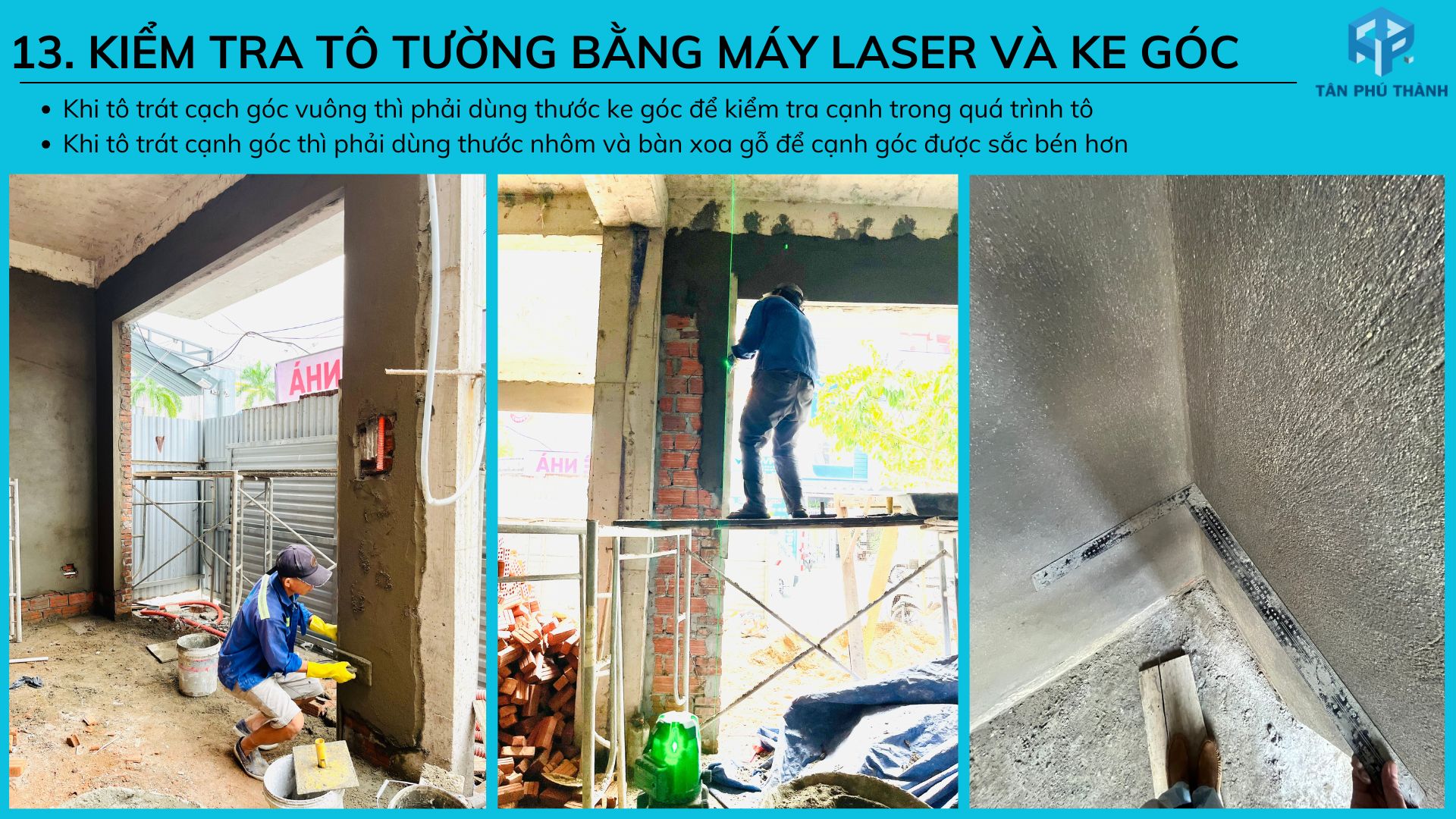 13. Kiểm tra tô tường bằng máy laser và thước ke góc