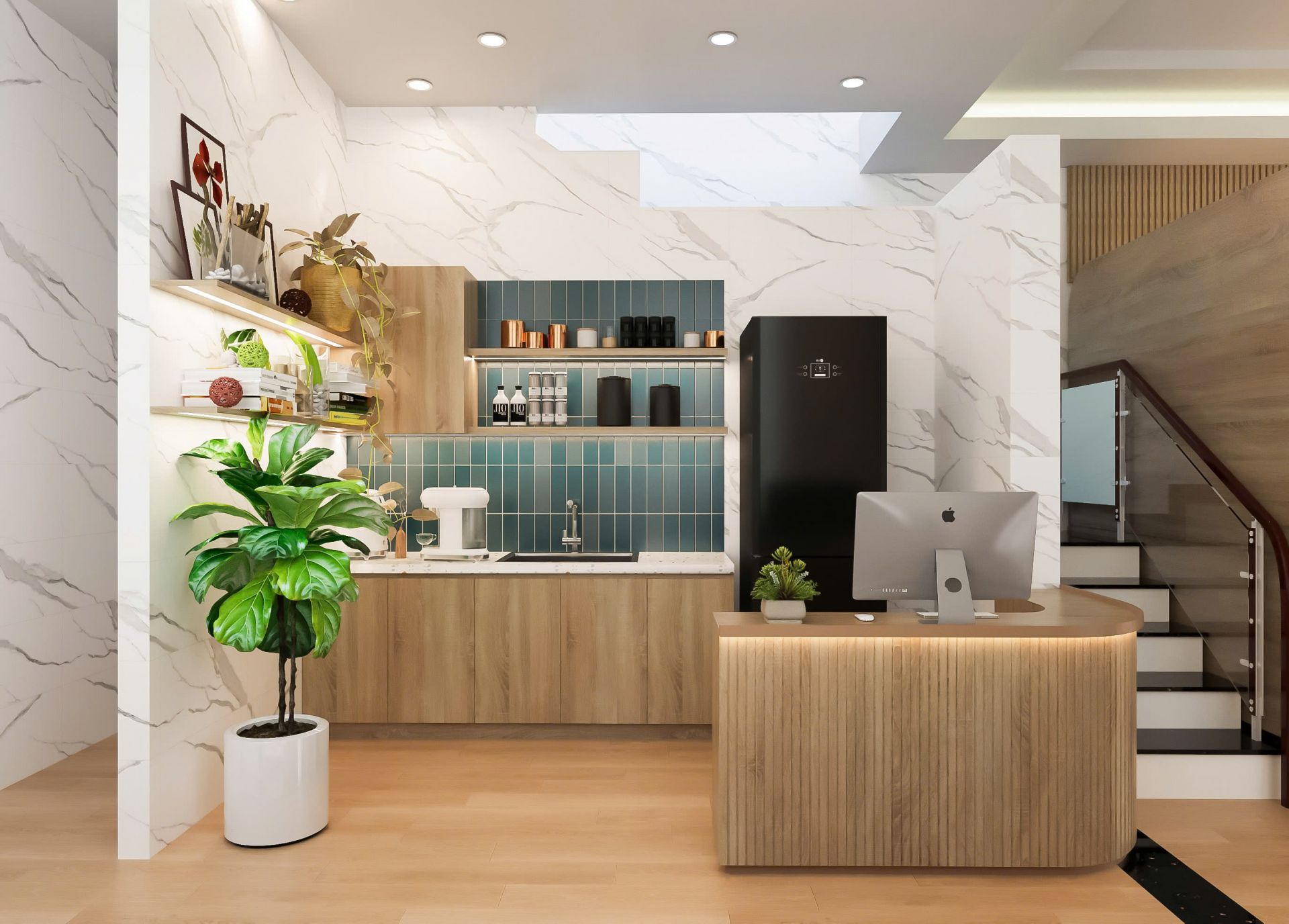 Quầy pha chế cafe đồ uống cho khách và gia đình dùng chung được bố trí gọn trong góc sáng ngay tầng trệt