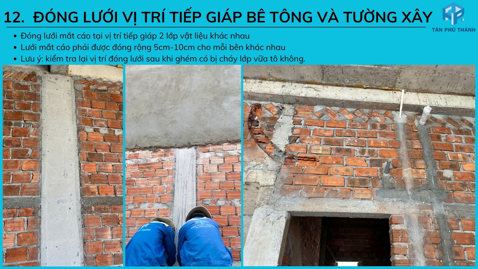 12. Đóng lưới vị trí tiếp giáp giữa bê tông và tường xây