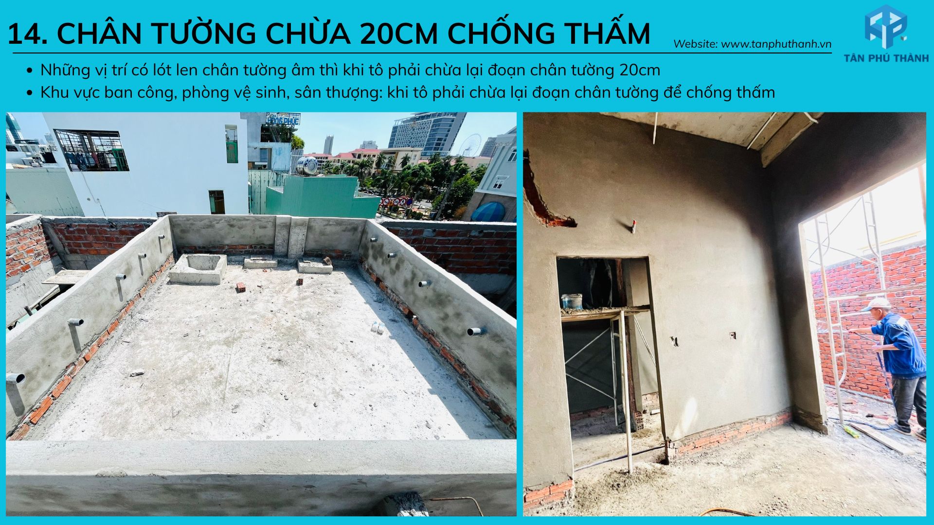 14. Chân tường vệ sinh, ban công, sân thượng, vị trí chống thấm chừa lại 20cm để chống thấm.