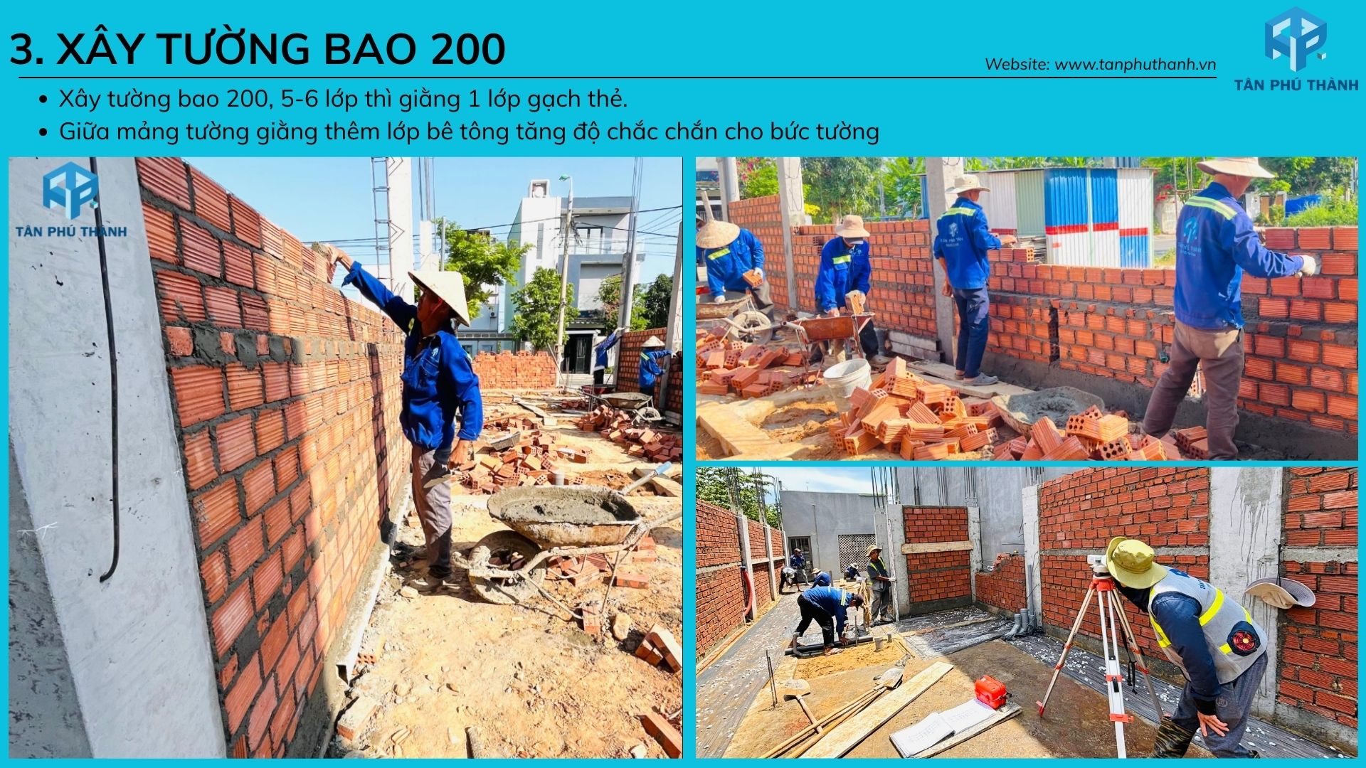 3. Xây tường bao 200, 5-6 lớp thì giằng 1 lớp gạch thẻ.
